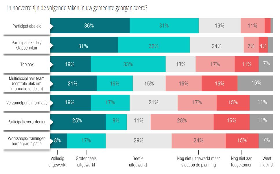 In totaal hebben 24.221 inwoners aan het onderzoek deelgenomen. Van hen is 49,6 procent man en 50,6 procent vrouw. Vooral in Gelderland, Noord-Holland, Noord-Brabant en Zuid-Holland is de deelname relatief hoog. Respectievelijk 12 procent, 16,6 procent, 14,8 procent en 21,3 procent van de deelnemers is afkomstig uit deze provincies. Van de deelnemers weet 59 procent van de inwoners wat het begrip burgerparticipatie betekent en heeft 32 procent weleens van dit begrip gehoord. Toch nog 8 procent kent het begrip niet. Zo’n 34 procent van de inwoners heeft het afgelopen jaar (weleens) informatie gezien over de mogelijkheden om samen te werken met de gemeente via sociale media. Een ander veelgenoemd communicatiekanaal is de dorpskrant (30 procent). Zo 24 procent heeft nog nooit informatie gezien over burgerparticipatie van de eigen gemeente.